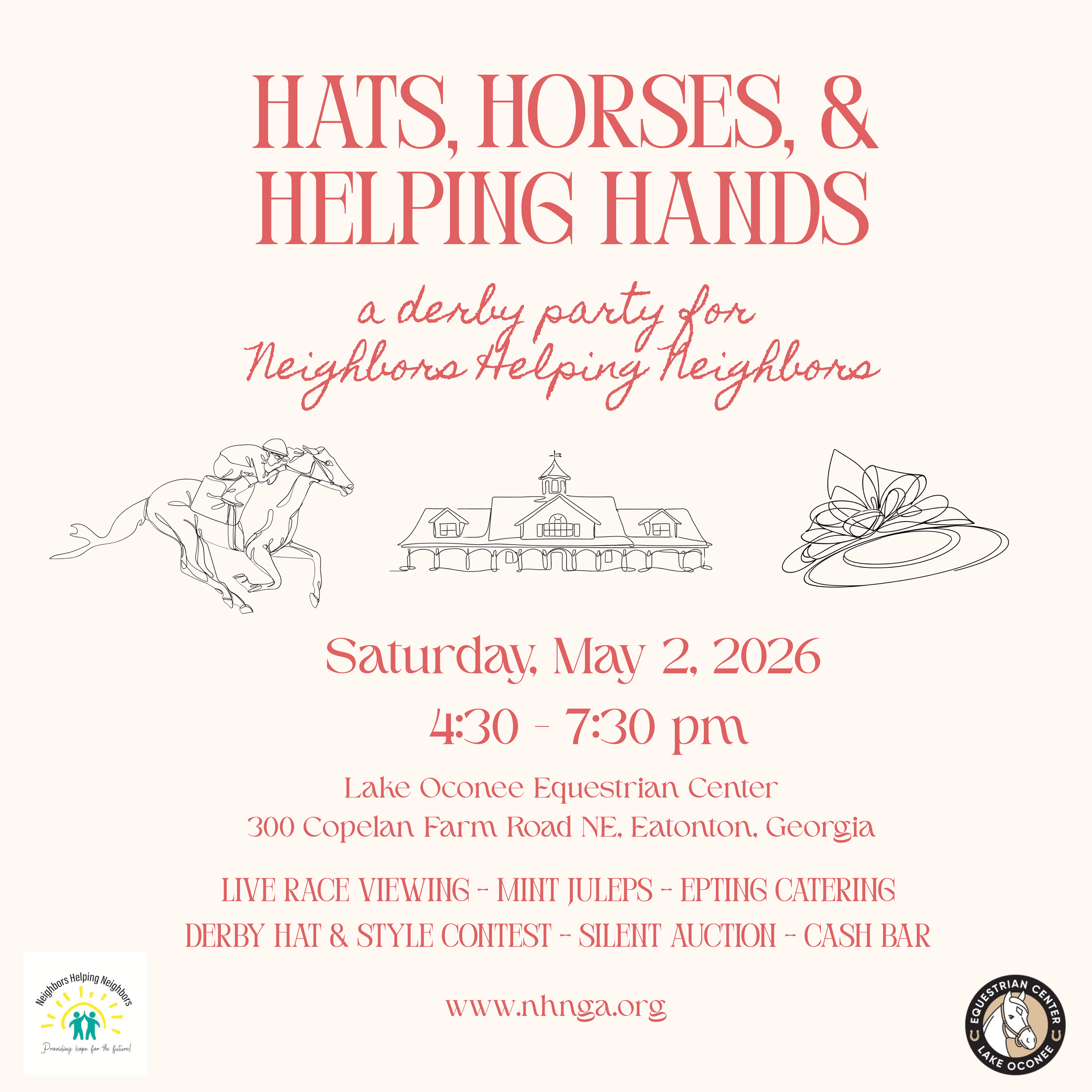 Join Neighbors Helping Neighbors for an unforgettable Derby Day experience at the Lake Oconee Equestrian Center (LOEC), a private 155-acre equestrian retreat created from a deep love of horses, land, and shared experience. This special gathering brings our Greene and Putnam County communities together to celebrate the spirit of the Derby while supporting NHN’s mission.